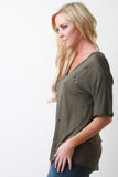 This feather weight jersey knit t-shirt features a v-neckline, short sleeves, casual relax fit, and distress holey cutout at front. Accessories sold separately. Made in U.S.A. 100% Rayon.