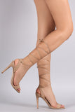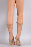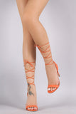 This alluring heel features an open toe silhouette, single strap across vamp, and wrapped stiletto heel. Finished with lightly padded insole and lace up closure.