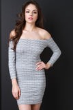 This bodycon dress features a bardot neckline, quarter-length sleeves, mini length hemline, multi-color texture knit fabrication, and a stretchy sculpture fit. Accessories sold separately. Made in U.S.A. 55% Polyester, 38% Rayon, 7% Spandex.