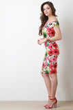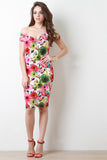 This bodycon dress features floral print on texture knit fabrication, sweetheart bardot neckline, and stretchy sculpture fit. Accessories sold separately. Made in U.S.A. 96% Polyester, 4% Spandex.