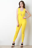 A soft stretch jersey knit jumpsuit featuring a sleeveless top, scooped round neckline and backline, and long tapered legs. Accessories sold separately. Made in U.S.A. 94% Cotton, 6% Spandex.