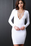 This strappy bodycon dress features a plunging v-neckline with caged yoke construction, long sleeves, sculpture fit, princess seam, and texture knit fabrication. Accessories sold separately. Made in U.S.A. 92% Polyester, 8% Spandex.