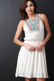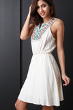 This sleeveless mini dress features a soft textured fabric, v-neckline with detailed embroidery and finished with an elasticized cinched waist. Accessories sold separately. Made in USA. Self: 100% Rayon. Lining: 100% Polyester.