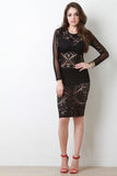 This bodycon dress features a semi-sheer mesh fabrication, stretchy silhouette fit, round neckline, long sleeves and midi length hemline. Made in U.S.A. Accessories sold separately. 90% Nylon, 10% Spandex.