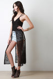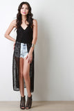 This sleeveless maxi slit crochet overlay. Designed with a v-neck and strappy back. Accessories sold separately. 90% Nylon. 10% Spandex. Contrast: 75% Rayon. 25% Polyester.