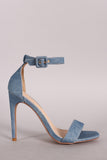This vintage-chic heel features a blue denim vegan leather, square toe, basic duo strap, open-toe silhoutte, single sole, and wrapped stiletto heel. Finished with lightly padded insole and adjustable ankle strap with buckle fastening.