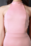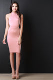 This bodycon dress features a mock neckline, sleeveless construction, cutout designs at waist and a midi length hemline. Finished with a racer back design with a zipper closure. Accessories sold separately. Made in U.S.A 96% Polyester, 4% Spandex.