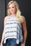 This sleeveless top features a v-neckline with lace trimming accent, spaghetti shoulder straps to a self-tie keyhole back, sharkbite hem, ruffle sides, and horizontal tribal striped pattern on texture knit fabrication. Accessories sold separately. 100% Rayon.