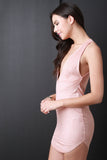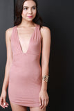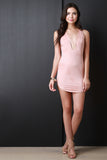 This mini dress features a sleeveless construction, a plunging v-neckline, and an elasticized vegan suede fabrication. Finished with a rounded hemline and sculpture fit. Accessories sold separately. Made in U.S.A. 90% Polyester, 10% Spandex.