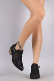 These edgy booties feature a distressed vegan suede upper with perforated detail, almond toe silhouette, side cutout design, and buckled strap accents at side. Finished with a low stacked heel and cushioned insole for comfort.