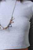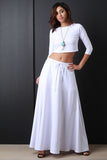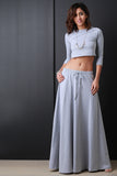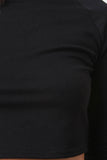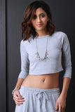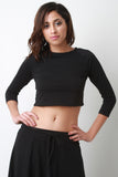 This top features a jersey knit fabrication, round neckline, and three quarter sleeve. Finished with a crop hemline. Accessories sold separately. 35% Cotton, 60% Polyester, 5% Spandex.