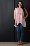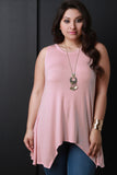 This plus size tunic top features a soft fabrication, round neckline, sleeveless construction, and an asymmetrical sharkbite hemline. Finished with an open back with a strappy accent. Accessories sold separately. 97% Viscose, 3% Spandex.