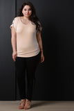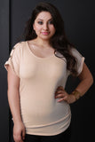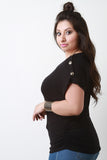This plus size top features soft fabrication, a round neckline, short sleeves with triple buttons accent, and gathered sides design. Accessories sold separately. 97% Rayon, 3% Spandex.