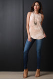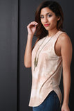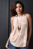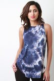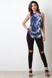 This top features a jersey knit tie dye fabrication, round neckline, sleeveless construction and finished with a round hemline. Accessories sold separately. Made in U.S.A. 96% Rayon, 4% Spandex.