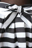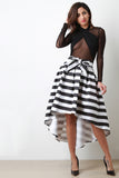 This box pleated skirt features two-tone color horizontal stripe fabrication, and a wide waistband with self-tie bow. Finished with a hidden side zip-up closure and high-low hemline. Accessories sold separately. Self: 100% Polyester. Contrast: 95% Polyester, 5% Spandex.