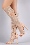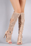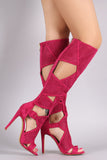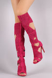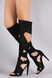 These edgy  knee high boots  feature a smooth vegan suede upper with perforated detail, open toe silhouette, and cutouts design with buckle accents. Finished with wrapped stiletto heel, lightly padded insole, and convenient back-zip closure.