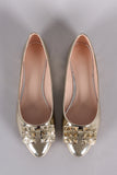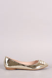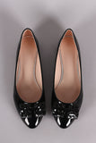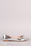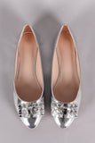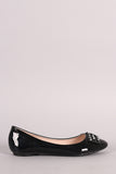This sweet  ballet flat  features a glossy patent adorned with a pyramid studded bow at the front. Finished with an almond toe silhouette, lightly cushioned insole, and easy slip-on style.