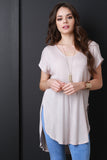 This casual top features a lightweight textured fabrication, scoop neckline, and short dolman sleeves. Finished with a high-low round hemline. Accessories sold separately. Made in U.S.A. 95% Rayon, 5% Spandex.