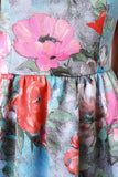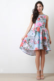 This sleeveless dress features a round neckline, gathered skater flare skirt, open back, elastic waist, high low hem, floral print, and fully lined with a built in petticoat. Accessories sold separately. 95% Polyester, 5% Spandex.