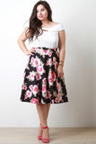 This plus size skirt features an a-line cut, wide elasticized waist, and roses pattern print. Accessories sold separately. Made in U.S.A. 92% Polyester, 8% Spandex.