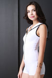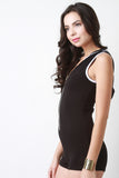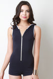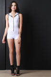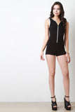 This sporty romper features a jersey knit fabrication, attached hoodie, sleeveless construction, contrasting detail on hoodie and arm opening, and front zip-up closure. Accessories sold separately. Made in U.S.A. 95% Cotton, 5% Spandex.