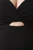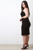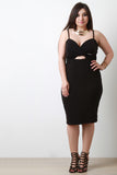 This plus size sleeveless midi dress features a textured stripe fabrication, sweetheart neckline, wrapped front with keyhole detail, spaghetti shoulder straps, back slit, and stretchy sculpture fit. Accessories sold separately. Made in U.S.A. 96% Polyester, 4% Spandex.