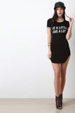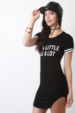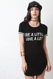 This dress features a rounded neckline, with a "Live A Little Love A Lot" screen print, soft rib knit fabrication, cap sleeves with a stripe trim, bodycon fit, finished with a rounded hemline. Accessories sold separately. 97% Rayon, 3% Spandex.