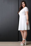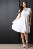 This plus size fit & flare dress features a round neckline, contrast mesh with a beautiful beadwork embroidery design, short sleeves construction, cinched waistline, and flare skirt. Accessories sold separately. Made in U.S.A. Self: 95% Polyester, 5% Spandex. Contrast: 90% Nylon, 10% Spandex.