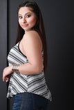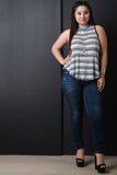 This plus size top features a mock neckline, sleeveless design, stripe pattern on texture knit fabrication, and a rounded hemline. Accessories sold separately. Made in U.S.A. 93% Rayon, 4% Polyester, 2% Nylon, 1% Spandex.