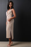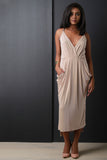Surplice Pleated Draped Side Slit High Low Midi Dress