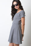 This stripe print throughout, short sleeves design, and flowy skirt. Accessories sold separately. 60% Polyester, 35% Rayon, 5% Spandex.