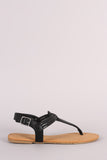 This flat sandal features a T-strap construction, triple instep straps design, lightly padded insole, and adjustable side buckle closure.