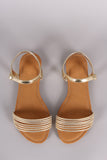 This flat sandal features an open toe silhouette, strappy rope construction across vamp, lightly padded insole, and adjustable ankle strap with buckle fastening.