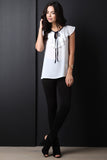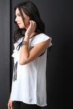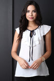 This blouse features a rounded neckline, ruffle trim, self tie keyhole, contrast bias trim, lightweight chiffon fabrication and a billowy loose fit. Accessories sold separately. Made in U.S.A. 100% Polyester.