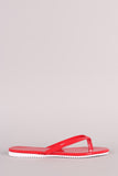 This casual flat sandal features a patent upper, thong construction, and easy slip-on design. Finished with a lightly padded insole.