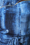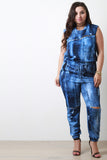 This plus size jumpsuit features a crew neckline, sleeveless, wide elasticized cinched waist with drawstring d�cor, side pockets, jogger style legs, zipper opening design at yoke and knees, finish with denim print throughout. Accessories sold separately. Made in U.S.A. 96% Polyester, 4% Spandex.