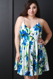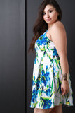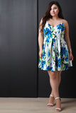 This flirty plus size dress features, a v neckline, elastic adjustable spaghetti straps, fitted bodice, pleated flare skirt, knit fabrication, finished with a water color floral print. Accessories sold separately. Made in U.S.A. 96% Polyester 4% Spandex.