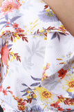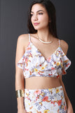 This pretty floral print fabrication, v-neckline with an adjustable spaghetti shoulder straps, ruffle overlay tier, elasticized crop hem, and back-tie closure. Accessory sold separately. 100% Polyester.