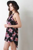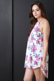 This adorable shift dress features a woven chiffon fabrication, floral peony print, spaghetti straps, back keyhole with button at nape, fully lined, with a rounded high low hemline. Accessories sold separately. Made in U.S.A. 100% Polyester.
