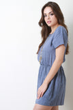 This cute romper features a woven fabrication, wide rounded neckline, loose fit, short sleeves, open style button up back, paper bag elastic a waist and a wide cut short. Accessories sold separately. Made in U.S.A. 100% Rayon.